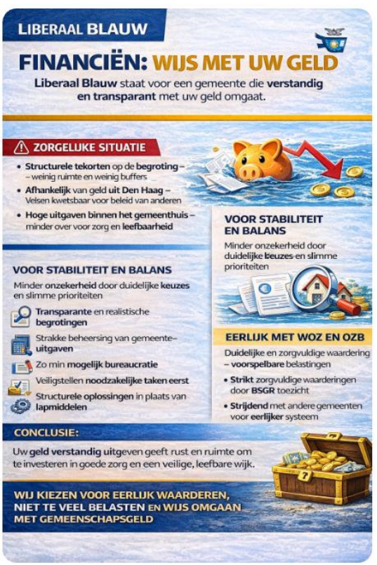 Liberaal Blauw staat voor een gemeente die verstandig en transparant met uw geld omgaat.