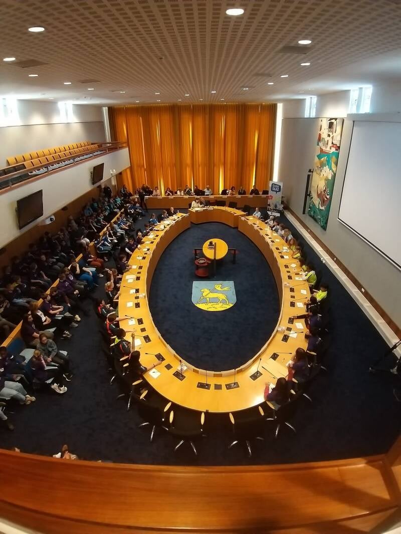 Na ontvangst in de Burgerzaal, liep de raadszaal vol met leerlingen uit groep 7 van de basisscholen.