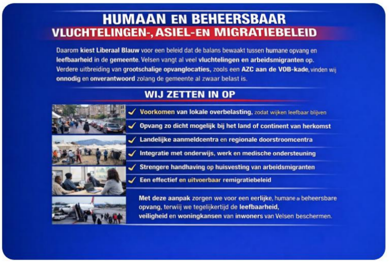 Liberaal Blauw is van mening dat de gemeente Velsen momenteel al een groot aantal vluchtelingen en (arbeids-)migranten huisvest en dat verdere uitbreiding van opvanglocaties, zoals een AZC aan de VOB-kade, onnodig en onverantwoord is. Een gemeente die kwetsbaar is en al duizenden migranten en vluchtelingen herbergt, kan niet onbeperkt nieuwe opvangplaatsen toevoegen zonder dat dit gevolgen heeft voor de leefbaarheid en de lokale woningmarkt.
