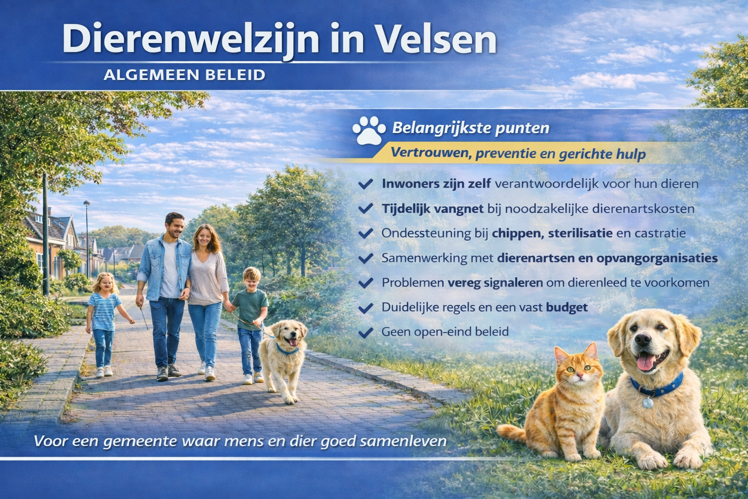 Liberaal Blauw staat voor zorgvuldig omgaan met dieren. In Velsen leven mensen samen met huisdieren, landbouwdieren en wilde dieren. Dierenwelzijn is voor ons geen symboolpolitiek, maar een vast onderdeel van goed, realistisch en vooruitkijkend bestuur.